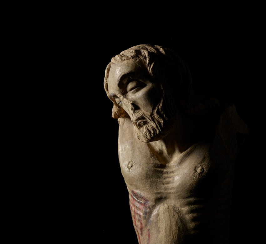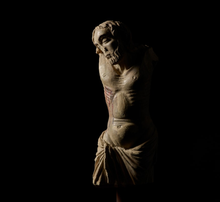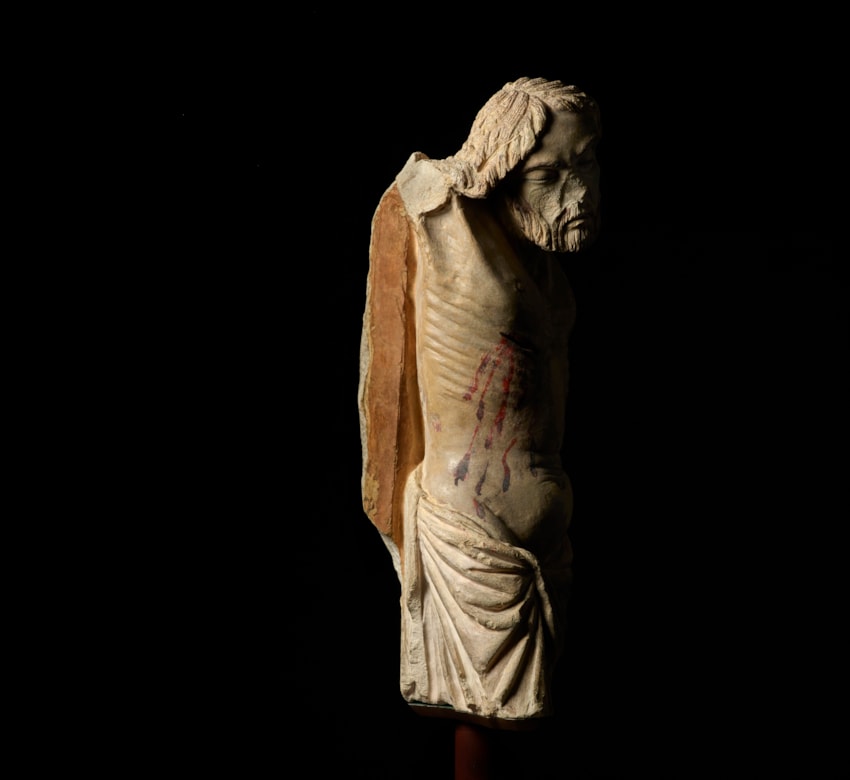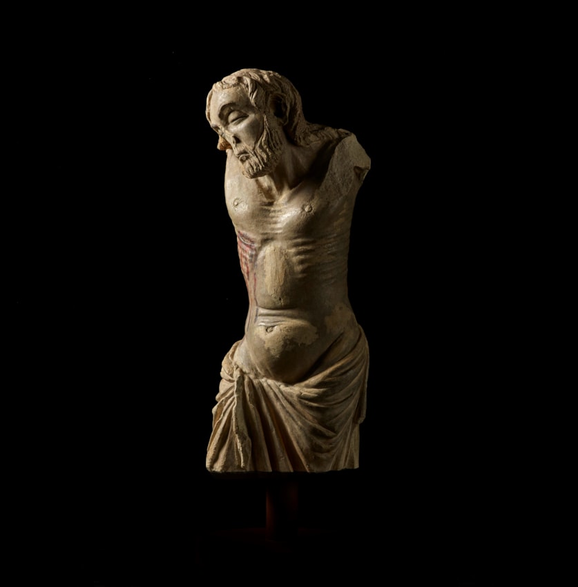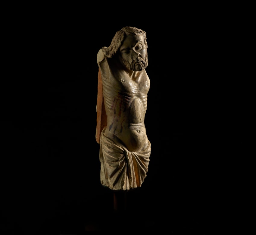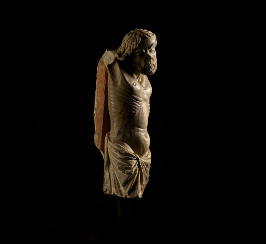Despite this, the drama of the figure is almost overwhelming. Christ is portrayed at a moment when all strength has been totally surrendered, and is emblematic of the presence of a profound interior life. The image aims to be true to life and it is consistent with the spiritual renewal widely encouraged at that time by the mendicant Franciscan and Dominican orders. Taking into account the relatively small dimensions and the vertical break on the back of the cross, it is also likely that the Torso was originally an integral part of a votive shrine or reredos. All this makes the naturalism of the still palpable original polychrome so wonderfully amazing: a good deal of light coloured flesh has survived, as well as some reddish drips of blood which flow from the wound in the side, while some brown coloured fragments can still be recognised on the side strands of the beard and the eyebrows. The plastic modelling of the anatomy is equally sophisticated, characterised by curves and sudden furrows which create a play of light and shadow that exalts the universal values of the subject.