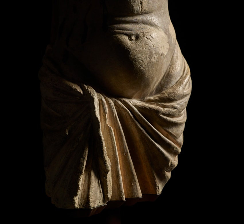 One of the elements that supports the attribution to Verona of this Torso is the type of local limestone from which the sculpture is made. The diagnostic analysis carried out during the recent philological restoration (2016-2017) identified it as Gallina stone. This is known to be a sandstone much used in Veronese sculpture at the time due to the proximity of the old quarries, now abandoned, in the environs of Avesa. It is a type of stone so soft that it favours carving and, in the case of the Crucifix in question as well as in most of the great works of the Master, it lends itself perfectly to the vivid expressive finishes which give a touch of genuine virtuosity. On the other hand, this increases the risk of damage, and our crucifix has not escaped unharmed over the course of the centuries: it has lost its limbs, only the section of the cross attached to the figure's back is left, just the lower part of the loincloth remains, the nose is broken and the right side of the face is missing.
