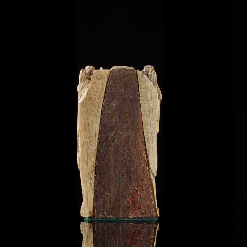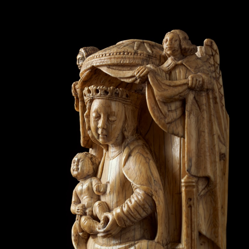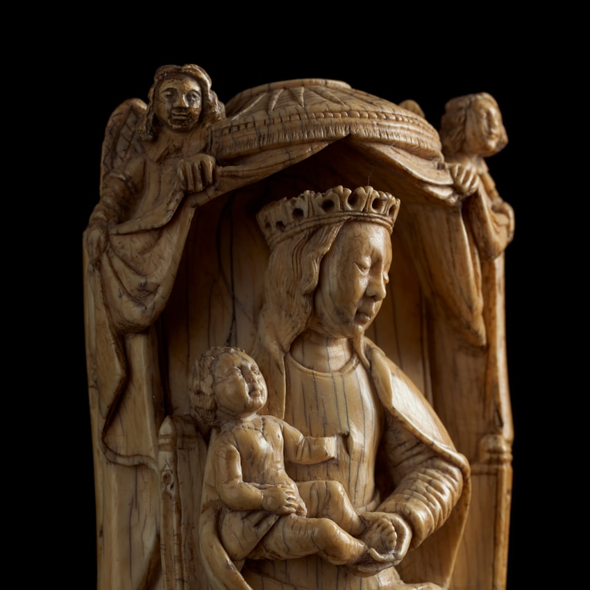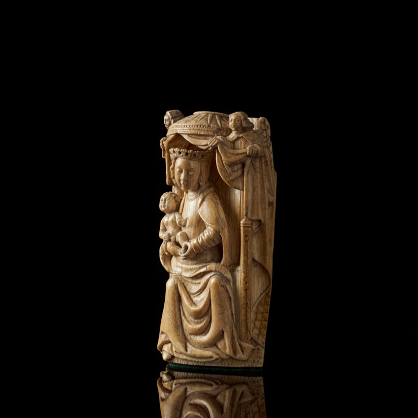 This rare and very beautiful crowned Virgin and Child, enthroned beneath a canopy whose curtains are being drawn back by angels, was made in the fifteenth century, most likely in the Netherlands. The ivory, whose small size suggests that it was produced for private devotion, was in the collection of the banker Henry Oppenheimer (1859-1932) until his death. It was described as French when it was shown in the 1923 exhibition of the finest European ivories at the Burlington Fine Arts Club (attached a pdf file from the catalogue of this exhibition.) in London, but an attribution to a regional school is in reality more complex, given the work's unique qualities. However, the physiognomy of the figures, with their round faces and bulging foreheads, as well as their slender fingers, suggests a Netherlandish origin.